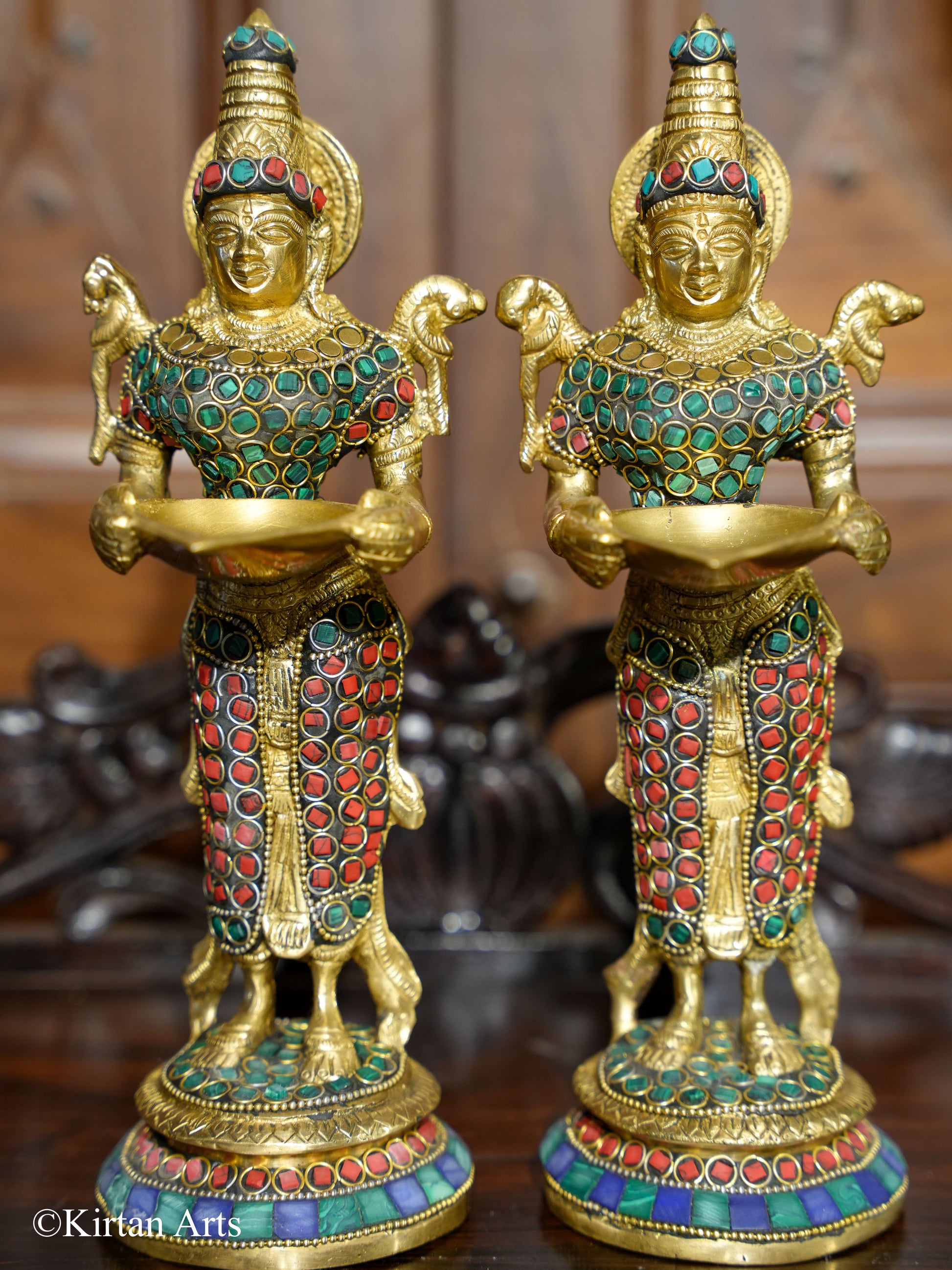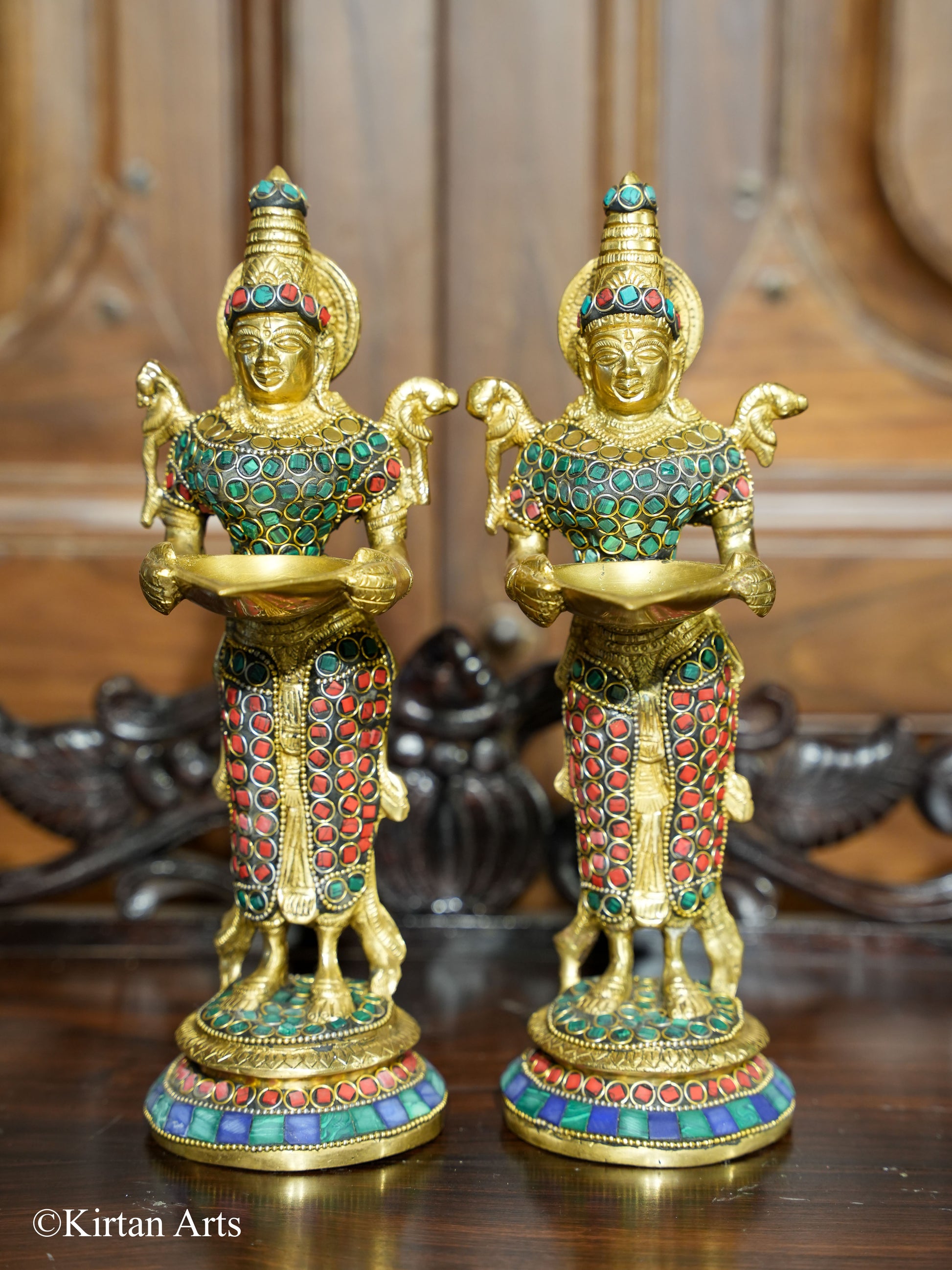 Brass Deep Lakshmi Pair Stonework 10.5"