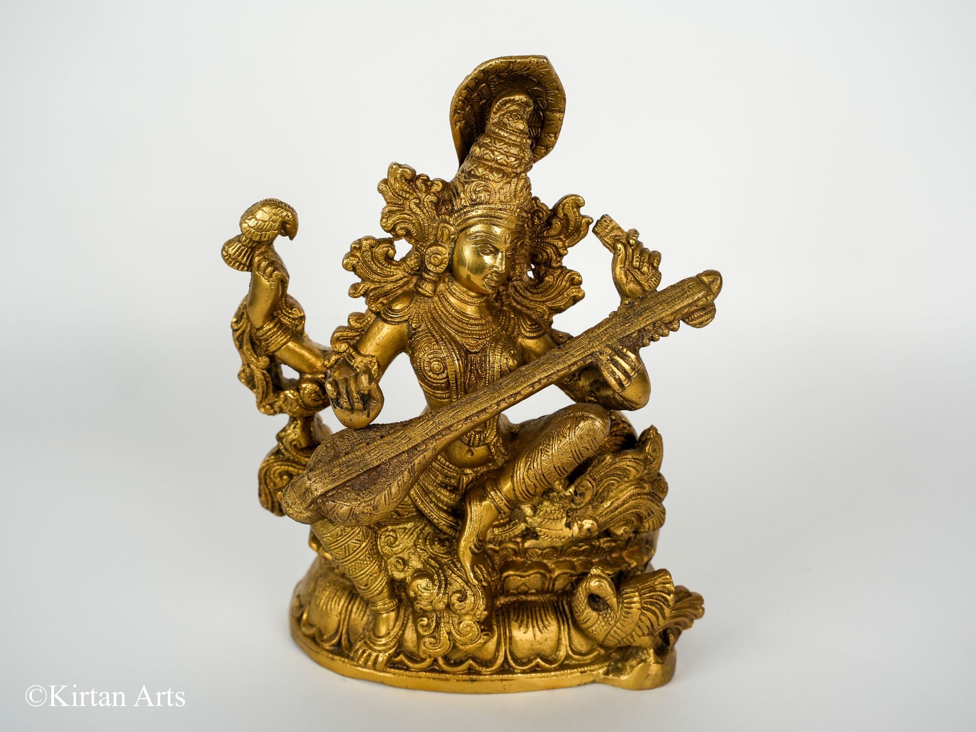 Bring divinity into your home with this beautifully handcrafted brass idol of Goddess Saraswati.