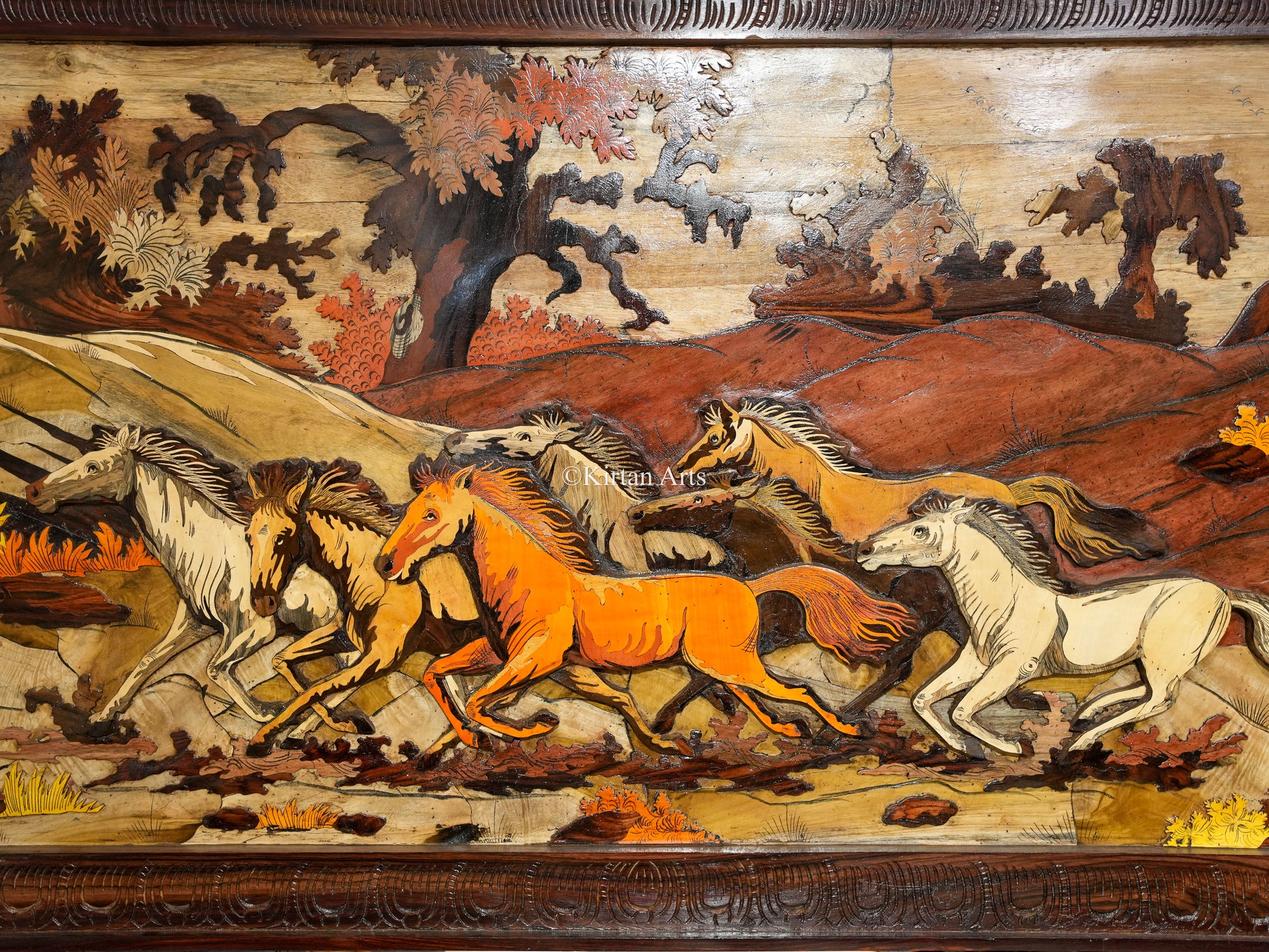 This 5x3 ft rosewood panel features expertly crafted 3D embossed artwork of five horses, symbolizing strength and good fortune. The rich texture and depth of the embossing enhance the natural beauty of rosewood, making it a sophisticated decorative piece that brings positive energy and elegance to any space. Ideal for those seeking a unique combination of artistic craftsmanship and symbolic significance.