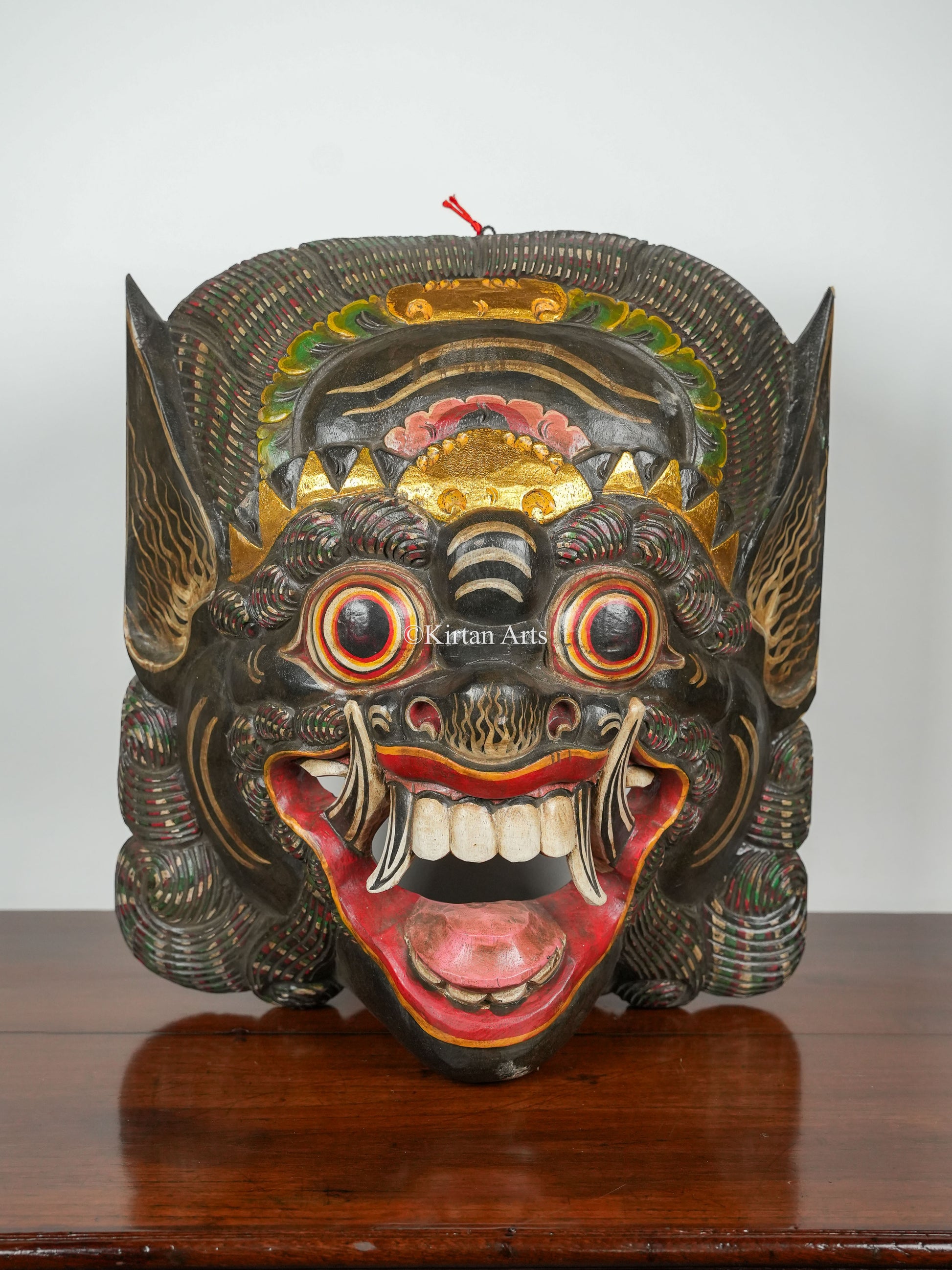 According to Indonesian mythology Barong is a lion-like creature that is believed to bring protection from evil. The wooden mask is hand-carved from acacia wood with a fierce fanged face and intricate decorations painted in gold and other colors.