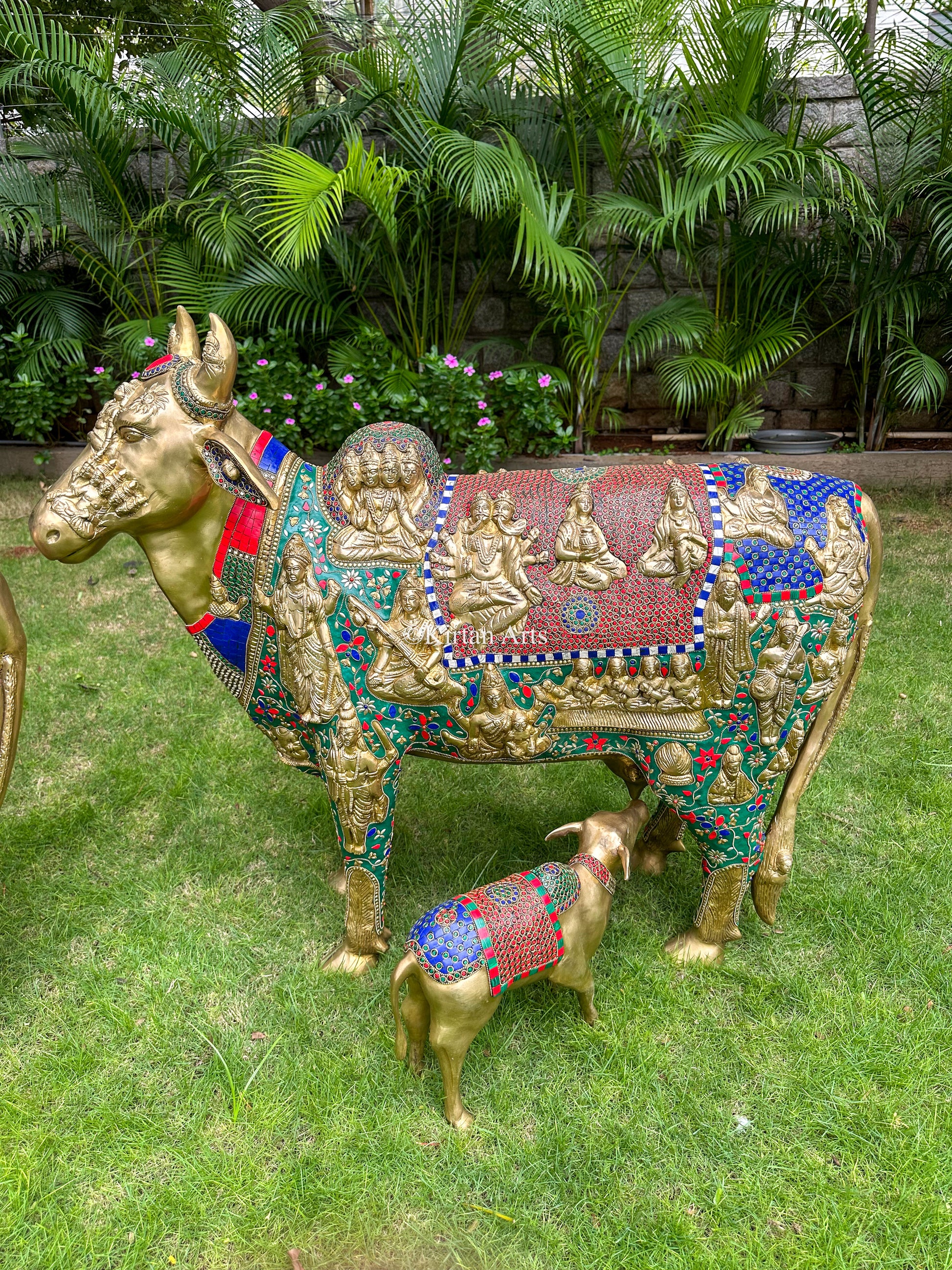 Brass Kamadhenu Cow and Calf | Meenakari work | 3ft