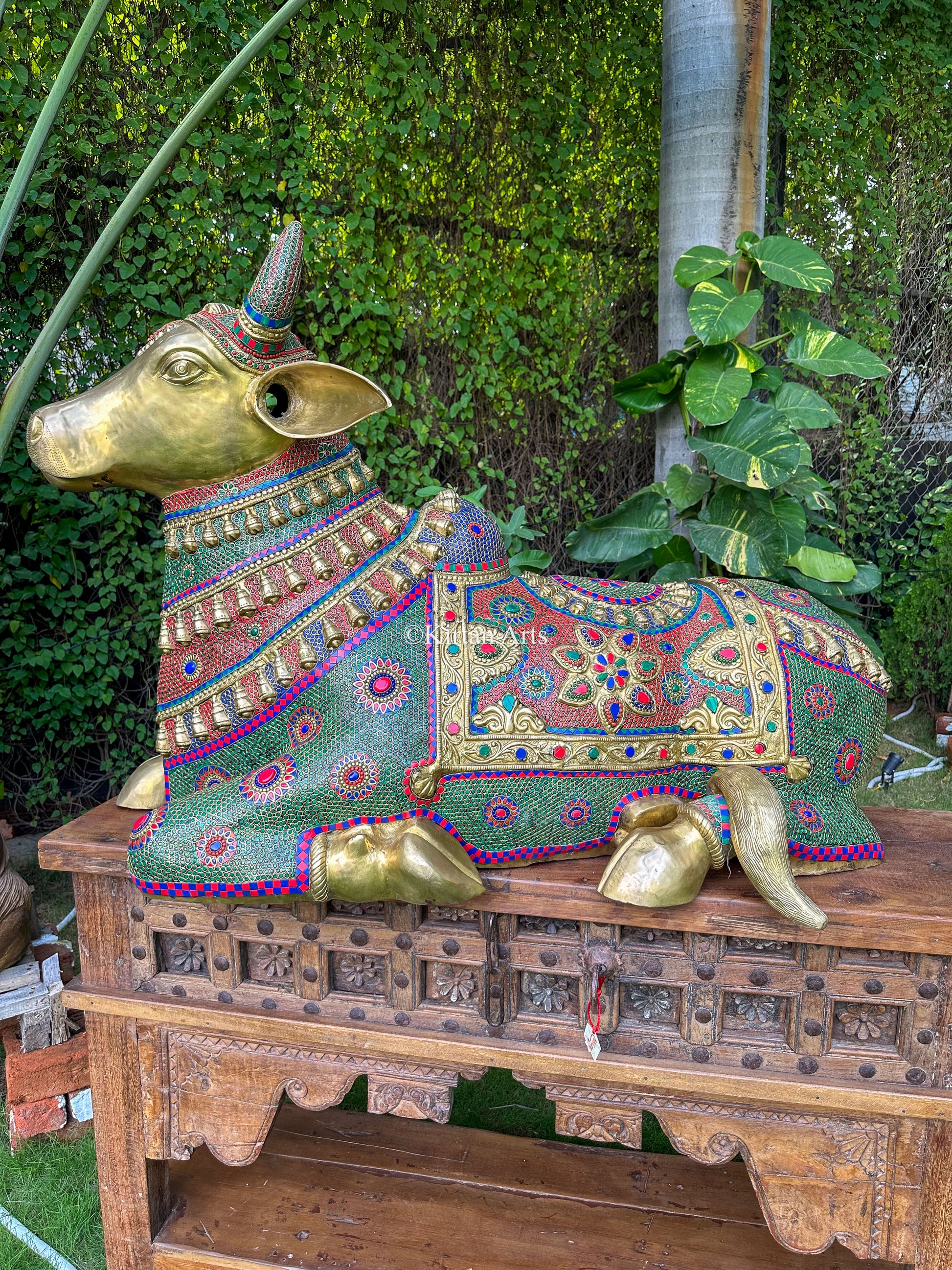 Enhance your environment with this exquisite large brass Nandi, featuring detailed stonework craftsmanship. Personalized finishes are offered to complement your decor, along with worldwide shipping options.
