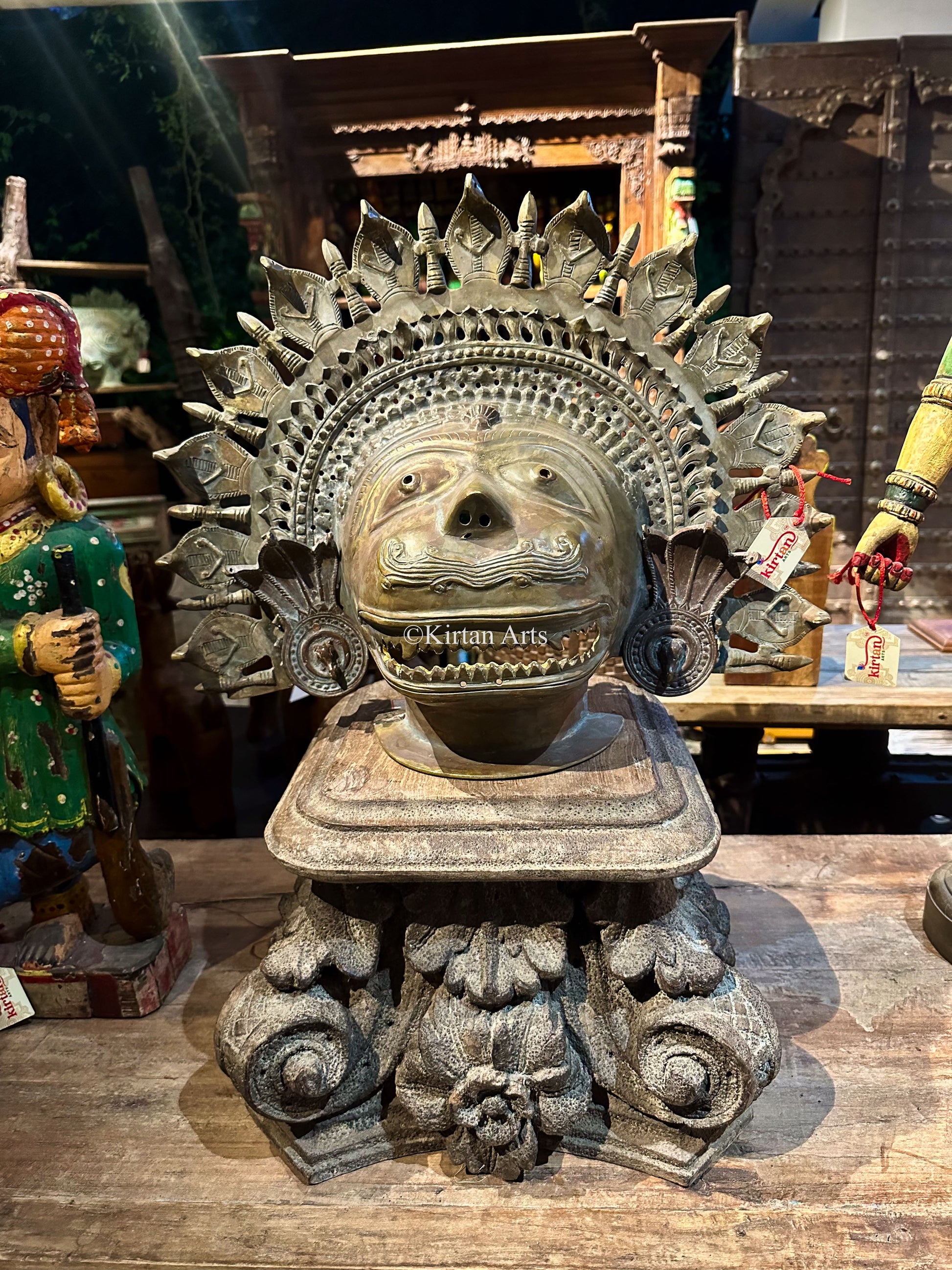 Transform your living space with this exquisite bronze Bhuta Mask, meticulously created through traditional lost wax casting techniques. Rooted in the sacred performance traditions of Kerala and Karnataka, this handcrafted piece carries the cultural heritage of ritualistic dance practices. Mounted on a vintage wooden stand, it serves as a striking focal point for shelves, consoles, and accent tables, infusing your interior with authentic artisanal character and timeless elegance.