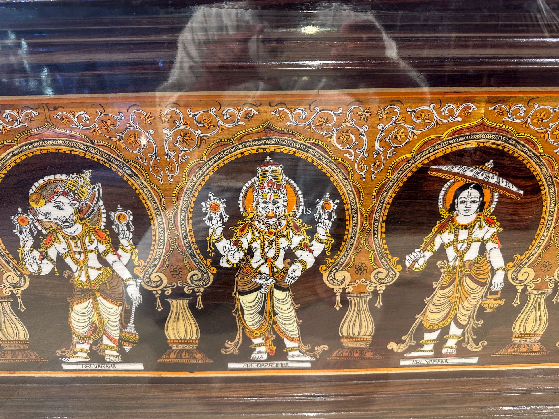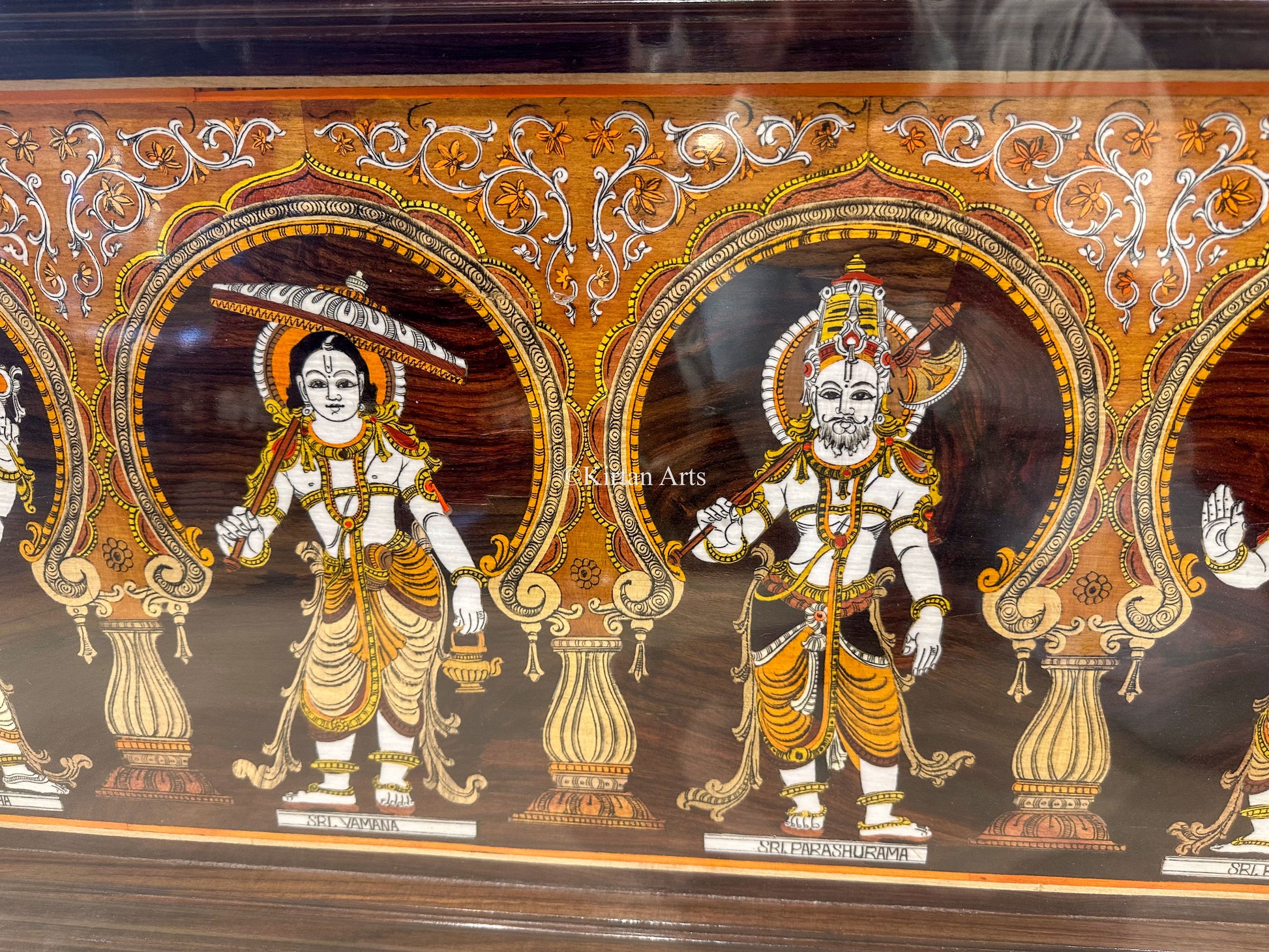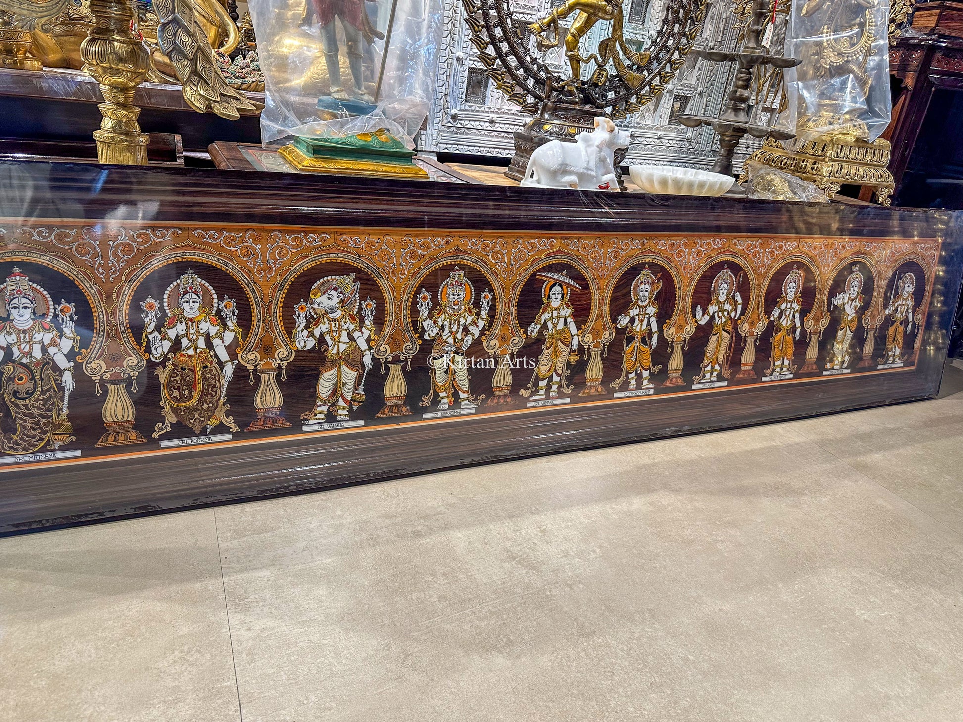 Presenting Lord Vishnu Dasavatars on a Rosewoood inlay panel. The 7ft long panel is made from pure rosewood and given a natural wood finish. Seasoned wood and acrylic are used for the inlay work intricately done by artists from south India. The Dasavataram are labelled and arranged in sequence, will be a great addition to your space.