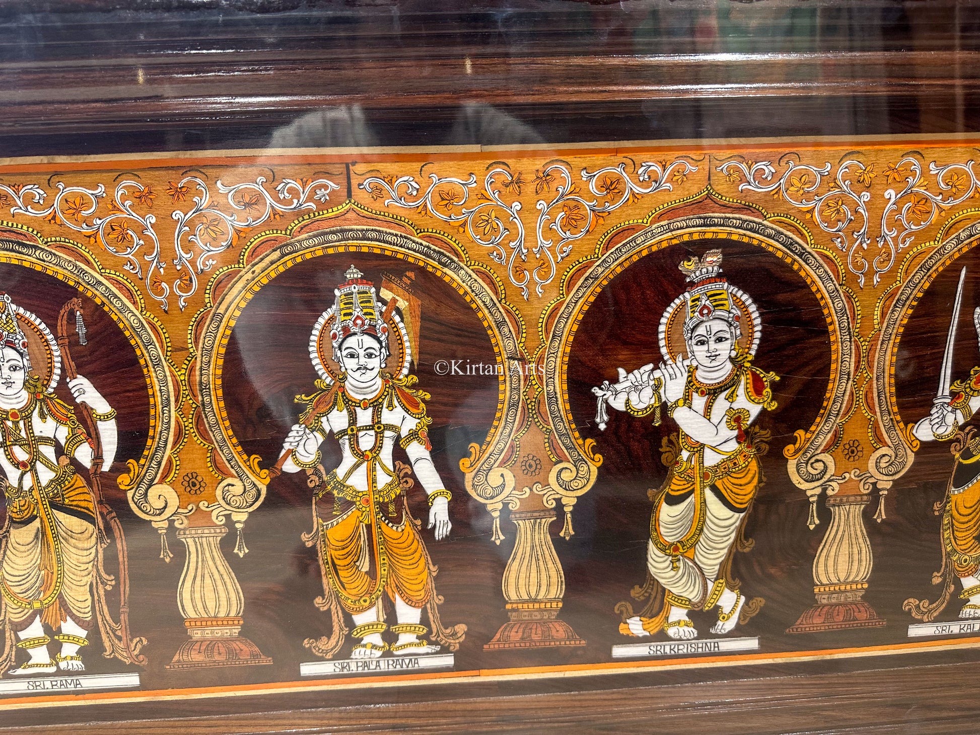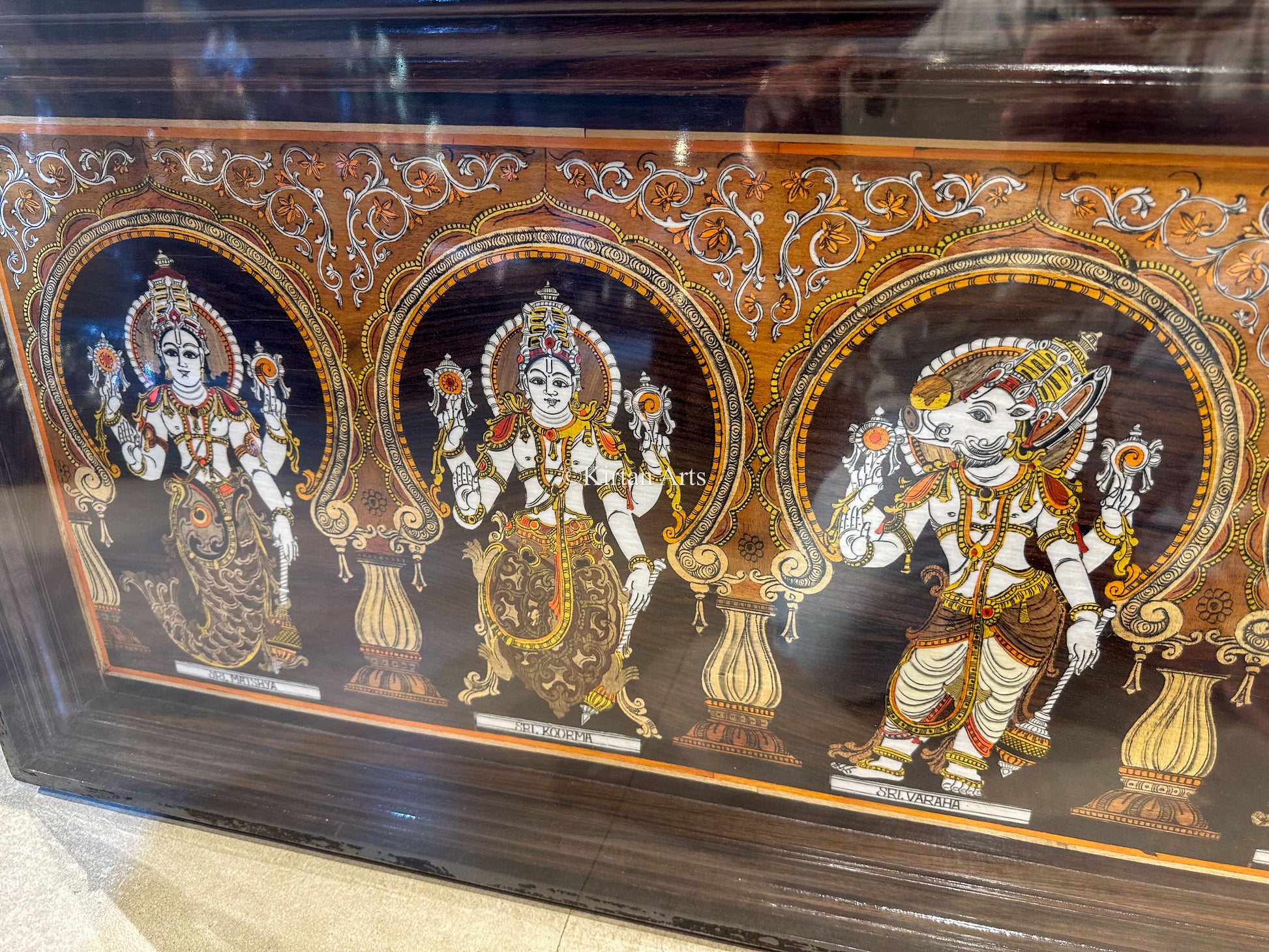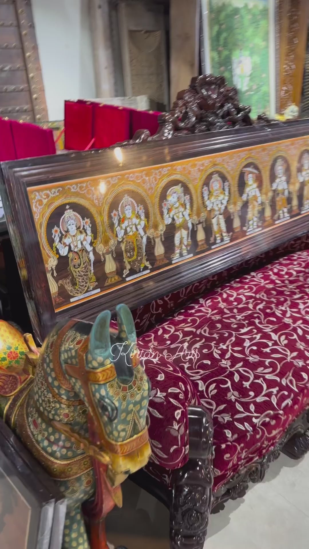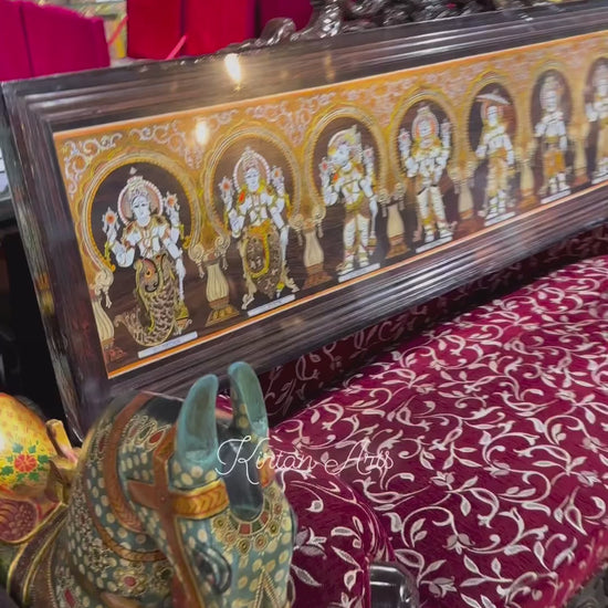 Presenting Lord Vishnu Dasavatars on a Rosewoood inlay panel. The 7ft long panel is made from pure rosewood and given a natural wood finish. Seasoned wood and acrylic are used for the inlay work intricately done by artists from south India. The Dasavataram are labelled and arranged in sequence, will be a great addition to your space.