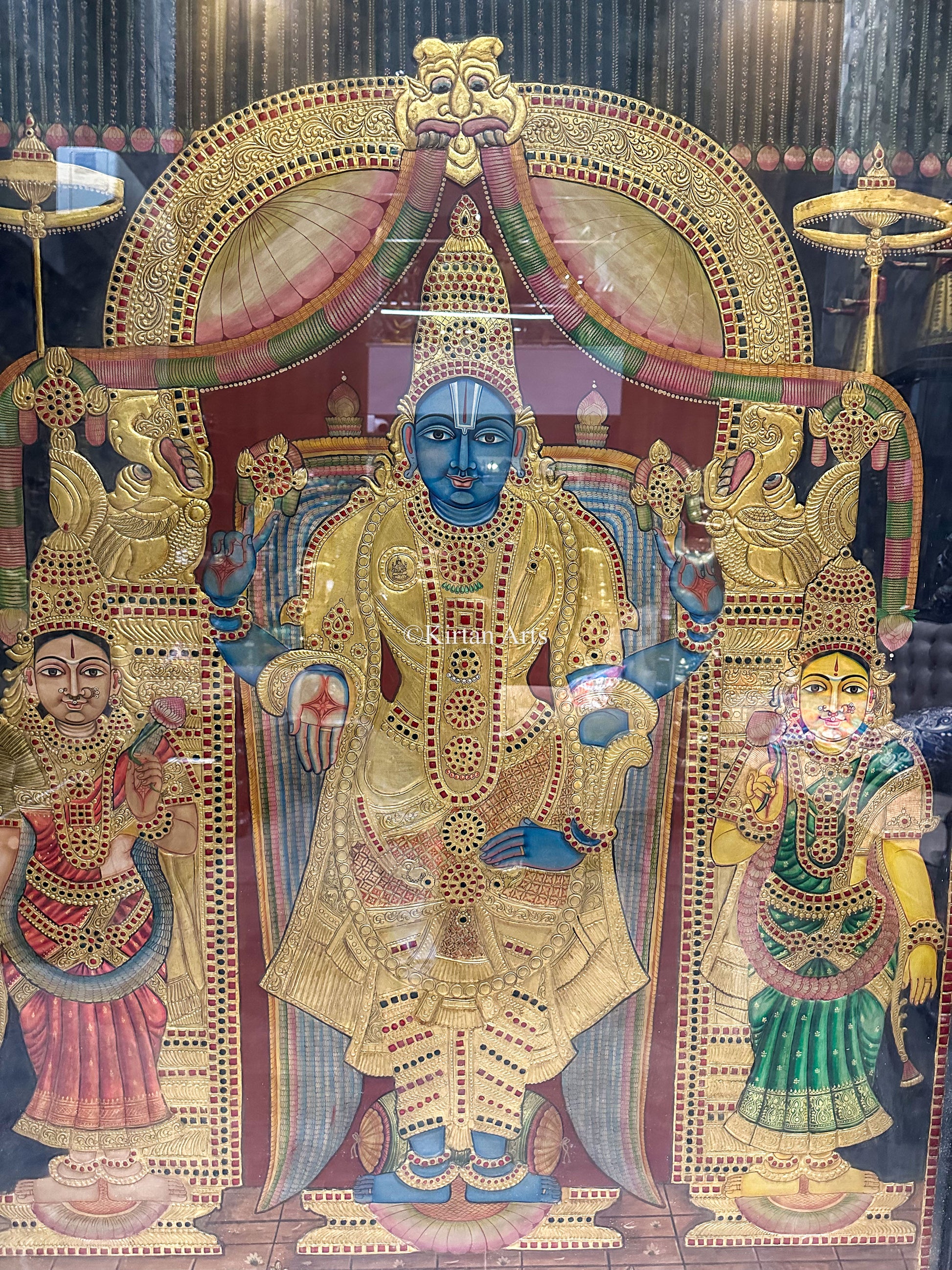 Lord Vishnu w Sridevi and Bhudevi Tanjore Painting | Antique Finish | 6x4ft | 22k Gold