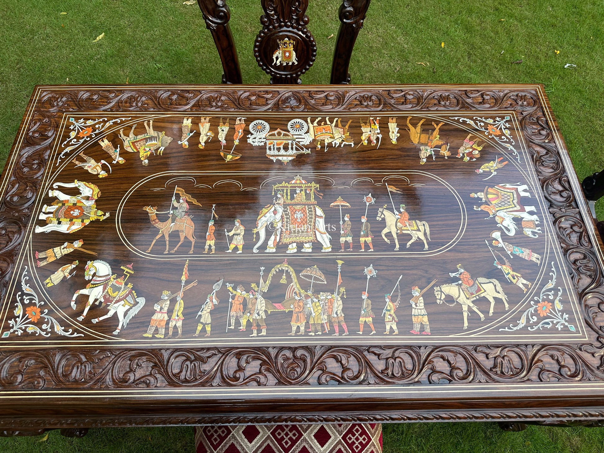 Elevate your home with this masterfully crafted dining table made from high quality Indian Rosewood. The table is adorned with inlay work Dussehra procession with elephants, and intricate cravings. The table is supported by thick legs carved from single blocks of rosewood, while carvings surround the table on the sides.