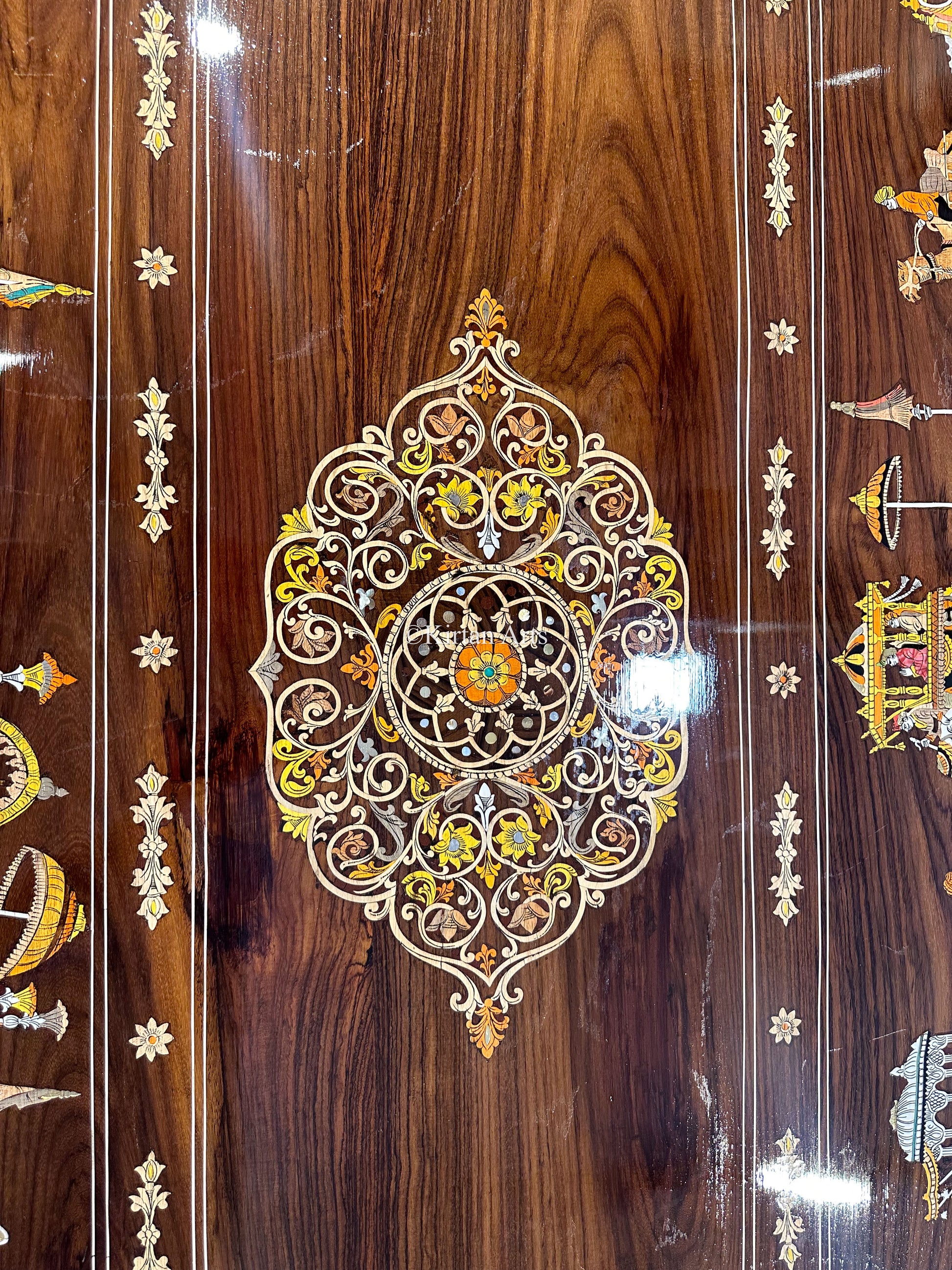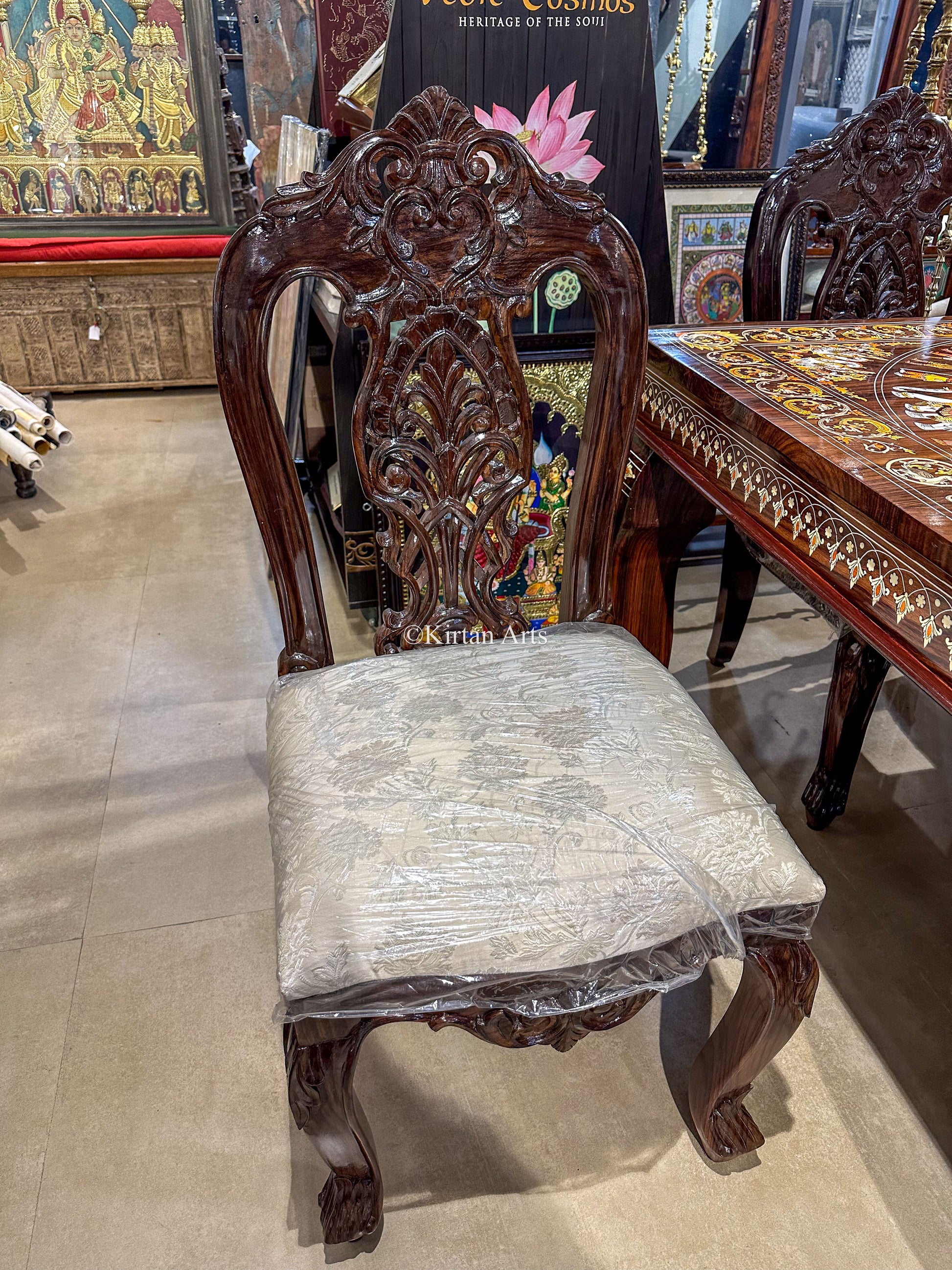 Rosewood Dining Table with inlay work from Kirtan Arts. The table is made from high quality Indian Rosewood and comes with 8 chairs. Coloured wooden pieces are inlaid into the wood for the effect and will last you a lifetime. The table top is adorned with flowers, peacocks, elephants, royal procession, and other Indian art.