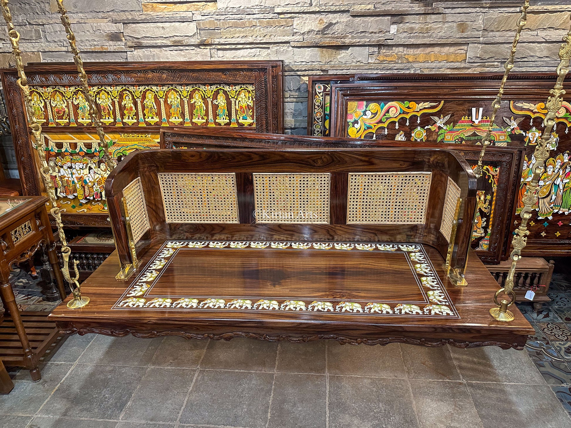 Experience the perfect marriage of traditional craftsmanship and refined elegance with this exquisite reversible swing from Kirtan Arts. Handcrafted from premium Indian rosewood, it showcases intricate elephant inlay detailing and authentic rattan embellishments that celebrate artisanal heritage. Complemented by sophisticated brass hardware and durable chains, this versatile piece elevates any interior or garden setting with timeless sophistication and enduring quality.