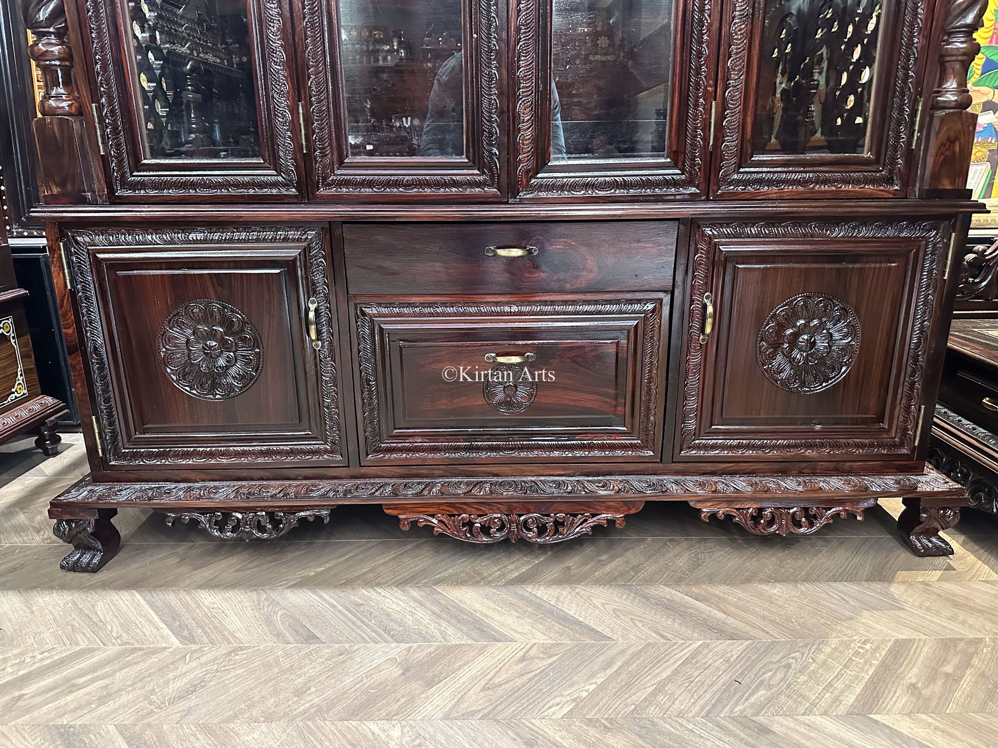 Elevate your Pooja space with this stunning mandir from Kirtan Arts, complete with storage and glass doors! Crafted from high-quality Indian rosewood, it features foldable doors, storage, and a pullout tray. Beautifully carved motifs add a touch of elegance, and it can be disassembled for easy storage and shipping.