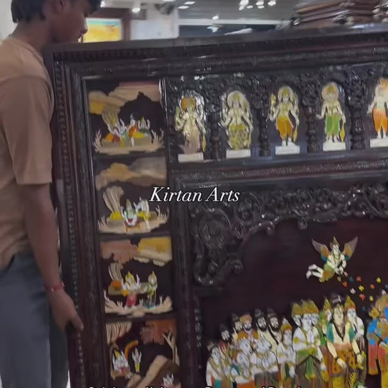 Srinivasa Kalyanam, the celestial marriage of Lord Balaji with Goddess Padmavathi, depicted beautifully in handcrafted 3D embossed art on wood. The panel is made from Rosewood and the embossed artwork is made from wooden pieces to create the 3D effect. Handcrafted Dasavatar of Lord Vishnu, adorn the top portion of the panel, for a divine picture. A thick rosewood mani frame completes the panel for a festive look.