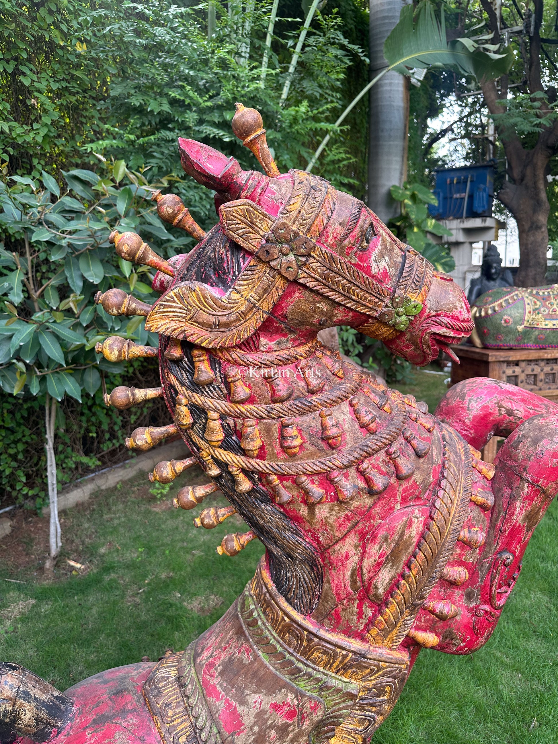 Elevate your home decor with this exquisite wooden horse, masterfully crafted with a distressed finish. The intricate details and wooden finishing bring the sculpture to life with remarkable realism.